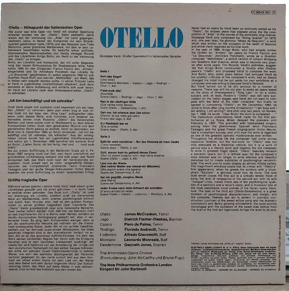 Giuseppe Verdi, James McCracken, Gwyneth Jones, Dietrich Fischer-Dieskau, Piero De Palma, Florindo Andreolli, The Ambrosian Opera Chorus, New Philharmonia Orchestra, Sir John Barbirolli – Otello - Grosser Querschnitt In Italienischer Sprache LP PLAK...