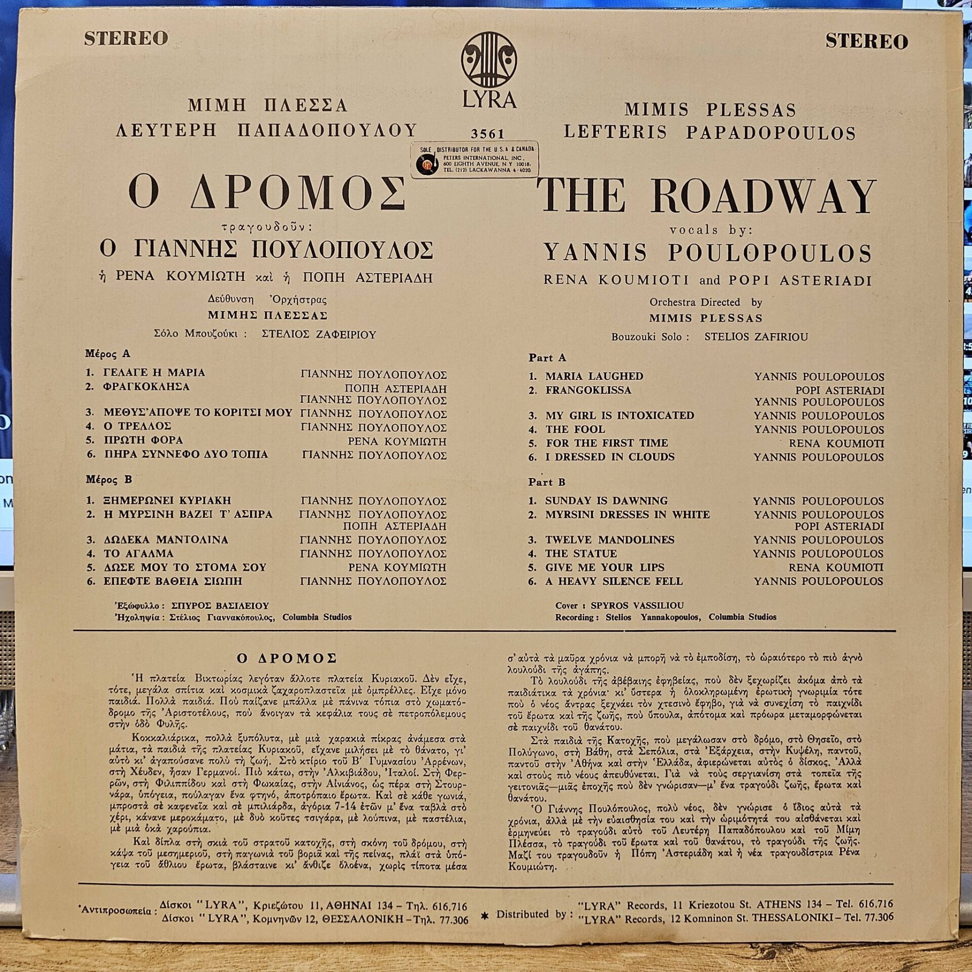 A1 Giannis Poulopoulos – Maria Laughed A2 Popi Asteriadi, Giannis Poulopoulos – Frangoklisa A3 Giannis Poulopoulos – My Girl Gets Drunk Tonight A4 Giannis Poulopoulos – The Crazy One A5 Rena Koumioti – First Time A6 Giannis Poulopoulos – I Took a Cloud Two Landscapes B1 Giannis Poulopoulos – Sunday Dawn B2 Giannis Poulopoulos, Popi Asteriadi – Myrsini Puts on the Whites B3 Giannis Poulopoulos – Twelve Mandolins B4 Giannis Poulopoulos – The Statue B5 Rena Koumioti – Give Me Your Mouth B6 Giannis Poulopoulos – Deep Silence Fell