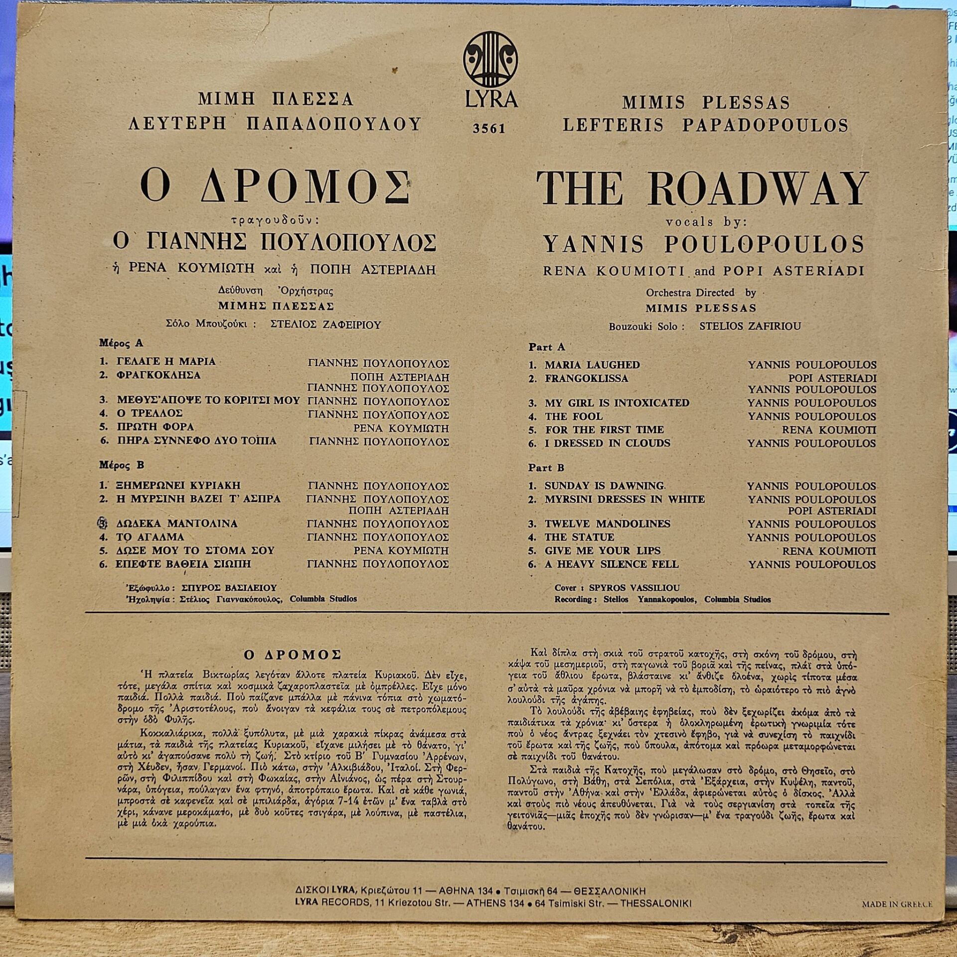A1 Giannis Poulopoulos – Maria Laughed A2 Popi Asteriadi, Giannis Poulopoulos – Frangoklisa A3 Giannis Poulopoulos – My Girl Gets Drunk Tonight A4 Giannis Poulopoulos – The Crazy One A5 Rena Koumioti – First Time A6 Giannis Poulopoulos – I Took a Cloud Two Landscapes B1 Giannis Poulopoulos – Sunday Dawn B2 Giannis Poulopoulos, Popi Asteriadi – Myrsini Puts on the Whites B3 Giannis Poulopoulos – Twelve Mandolins B4 Giannis Poulopoulos – The Statue B5 Rena Koumioti – Give Me Your Mouth B6 Giannis Poulopoulos – Deep Silence Fell